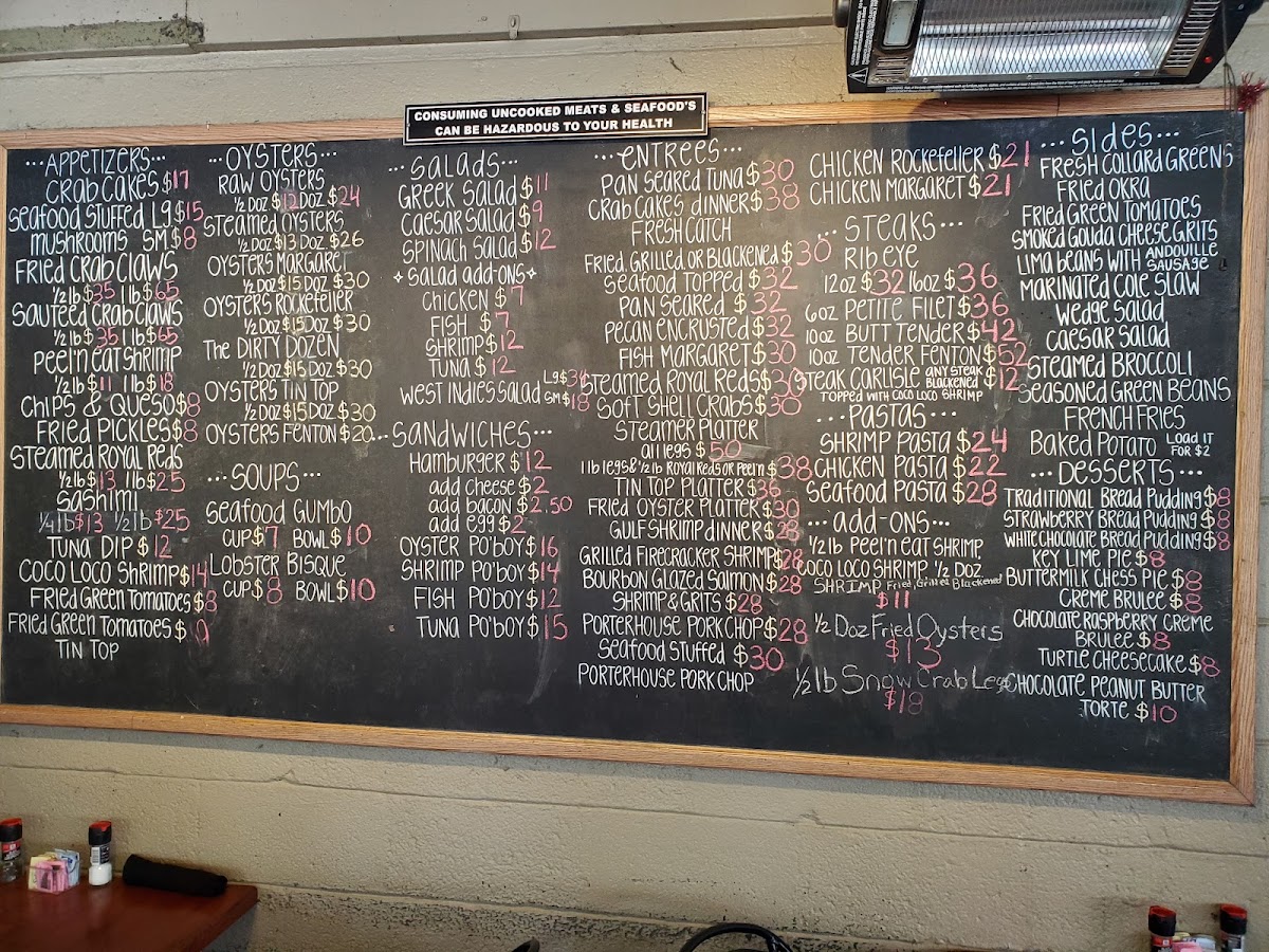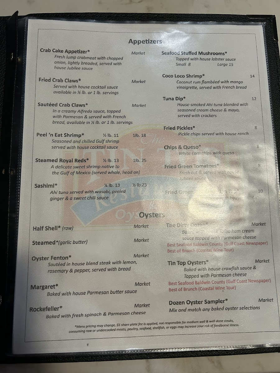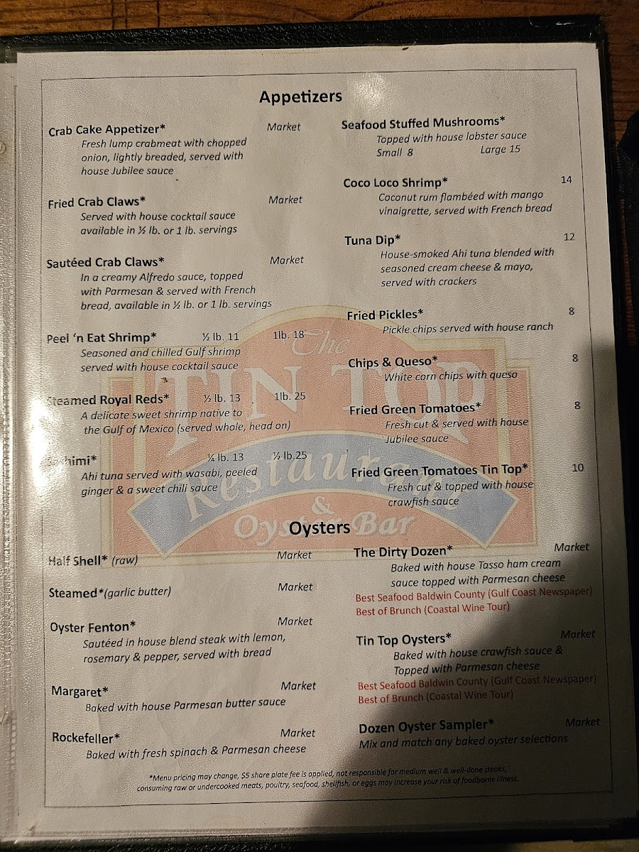 The Tin Top Restaurant & Oyster Bar in Bon Secour, AL, delivers a fresh and vibrant seafood experience that stands out. Their oyster selection is impressive, featuring classics like Half Shell raw oysters and creative bakes such as Oysters Rockefeller, Margaret, and the signature Tin Top with crawfish sauce. Steaks also play a starring role, from the tender Rib Eye and Butt Tender to inventive dishes like the Steak Carlisle topped with coco loco shrimp. Each dish balances rich flavors and bold Southern charm.