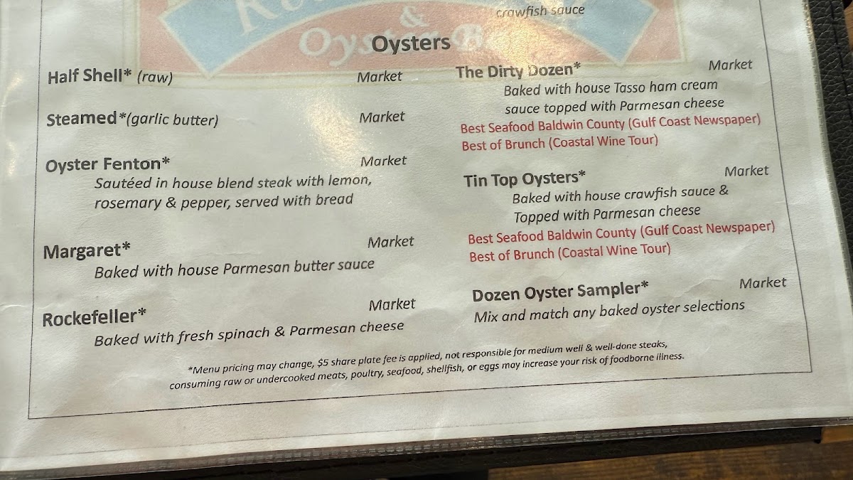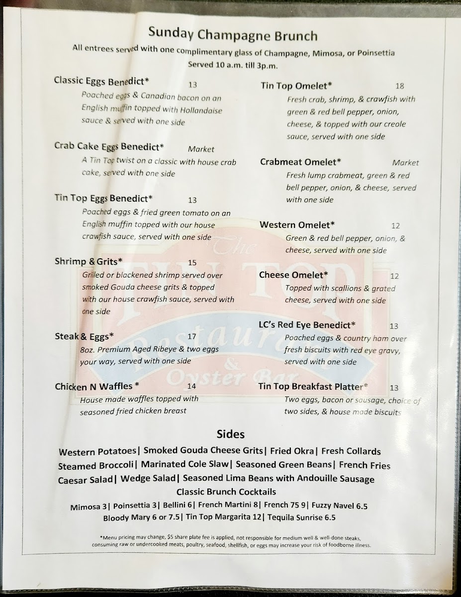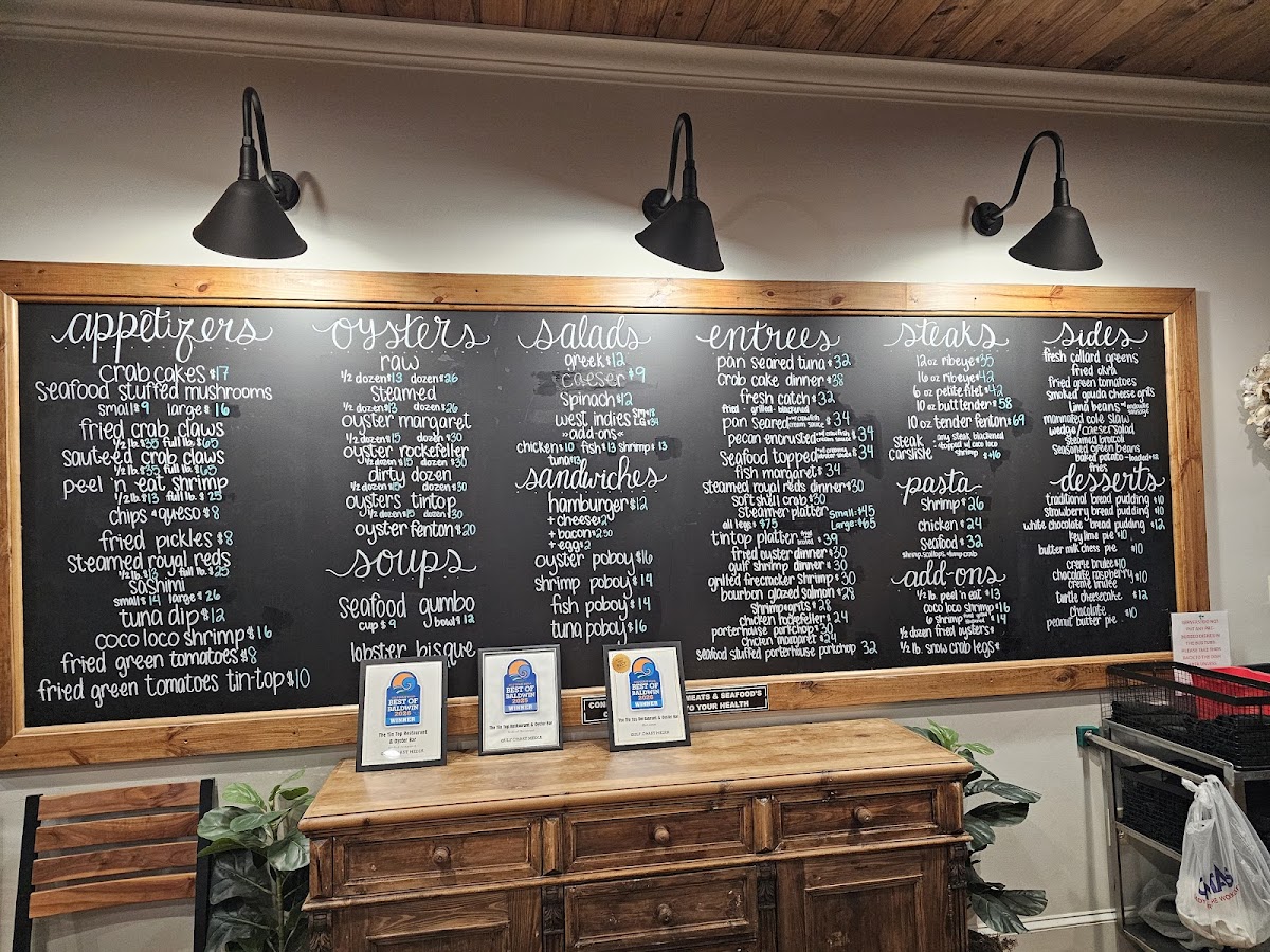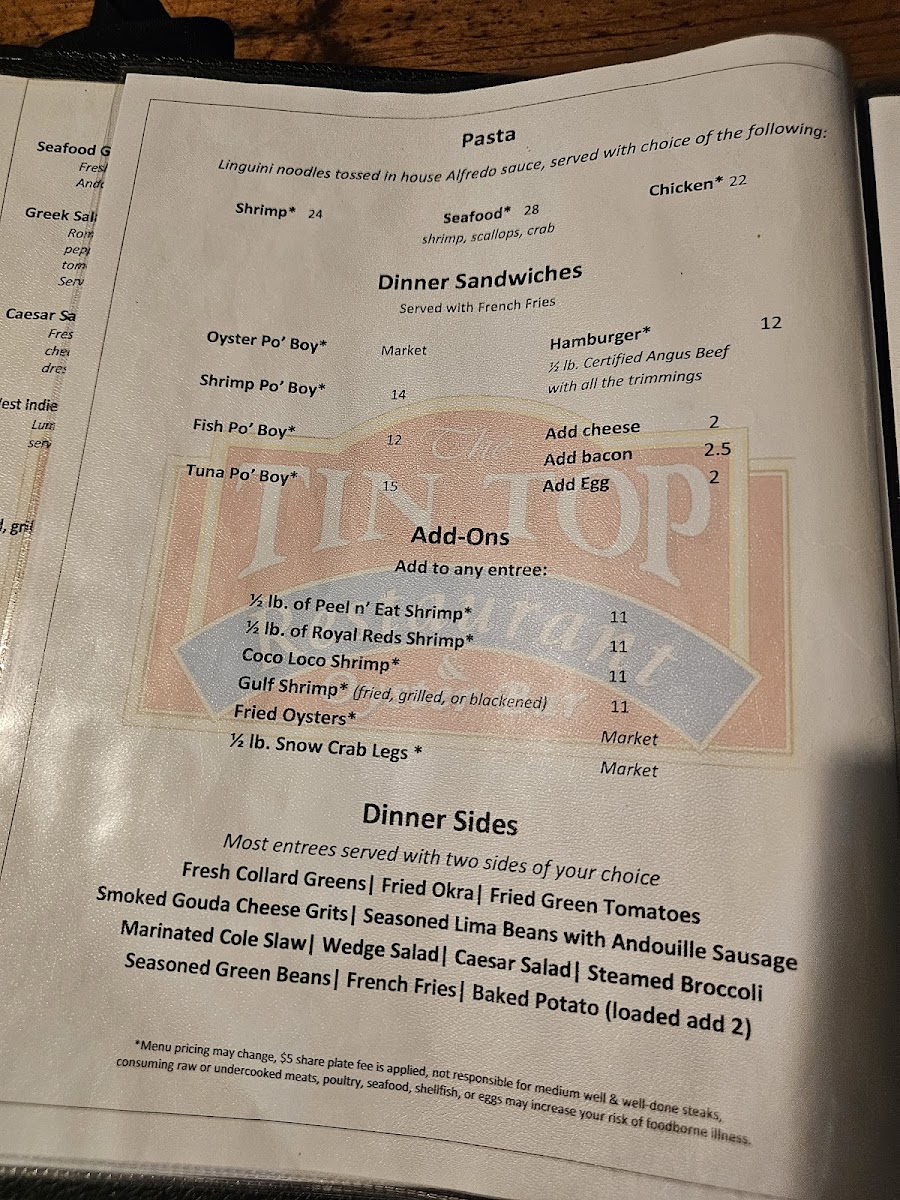 The Tin Top Restaurant & Oyster Bar in Bon Secour, AL, delivers a fresh and vibrant seafood experience that stands out. Their oyster selection is impressive, featuring classics like Half Shell raw oysters and creative bakes such as Oysters Rockefeller, Margaret, and the signature Tin Top with crawfish sauce. Steaks also play a starring role, from the tender Rib Eye and Butt Tender to inventive dishes like the Steak Carlisle topped with coco loco shrimp. Each dish balances rich flavors and bold Southern charm.